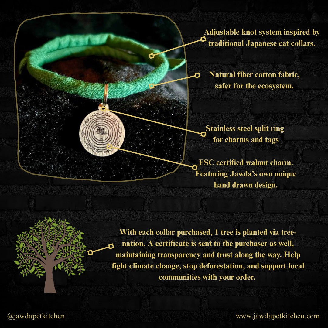 Inspired by nature and designed with intention, the Eco Forest Cat Collar is a minimalist, eco-conscious accessory handcrafted for cat parents who value sustainability without sacrificing style. Made from soft forest green cotton, this collar features a custom Jawda-designed charm, printed using VOC-free, non-toxic inks for a safer, more earth-friendly finish.